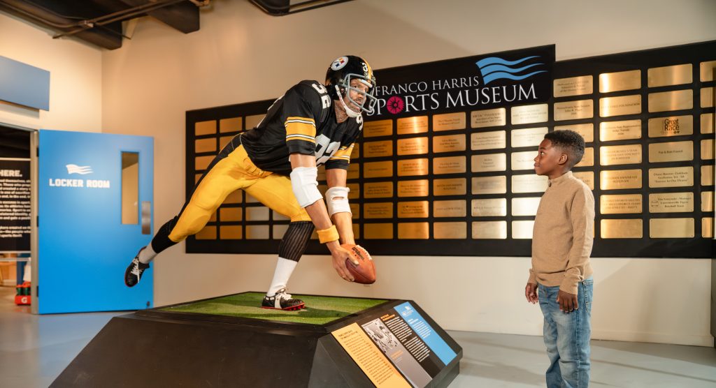 A young visitor at the entrance of the Franco Harris Sports Museum.